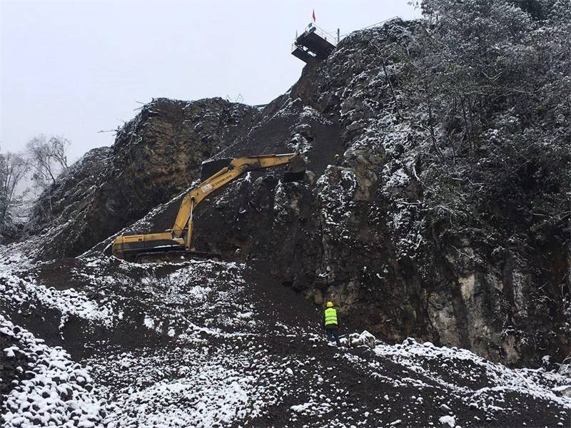 目前,廠區(qū)共8輛車在運行施工,主要用施工材料運輸,啟動3臺挖機(jī)進(jìn)行礦山防護(hù)網(wǎng)安裝,初步完成安裝礦山防護(hù)網(wǎng)的前期準(zhǔn)備工作。2月15日,舉行復(fù)工儀式,天全縣相關(guān)部門對項目進(jìn)行復(fù)工資料驗收檢查,已具備開工條件。丹石公司員工正迎著風(fēng)雪在大山上加緊施工,確保魚泉獅子山礦山開采項目能夠盡快完工。