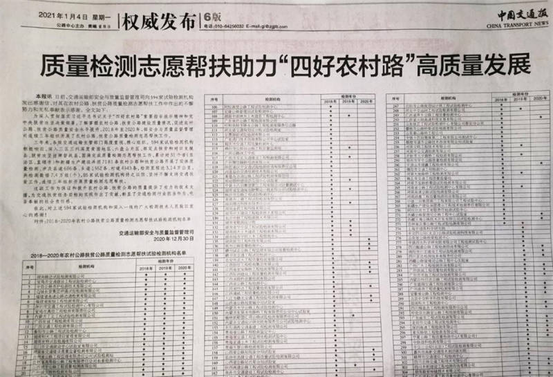 2020年12月30日,佳岳公司收到來自交通運輸部安全與質(zhì)量監(jiān)督管理司的感謝信,并在1月4日中國交通報6版以《質(zhì)量檢測志愿幫扶助力“四好農(nóng)村路”高質(zhì)量發(fā)展》為題進行了專題報道,對交建集團佳岳檢測公司在農(nóng)村公路、扶貧公路質(zhì)量檢測志愿幫扶工作中作出的不懈努力和無私奉獻(xiàn)表示感謝。