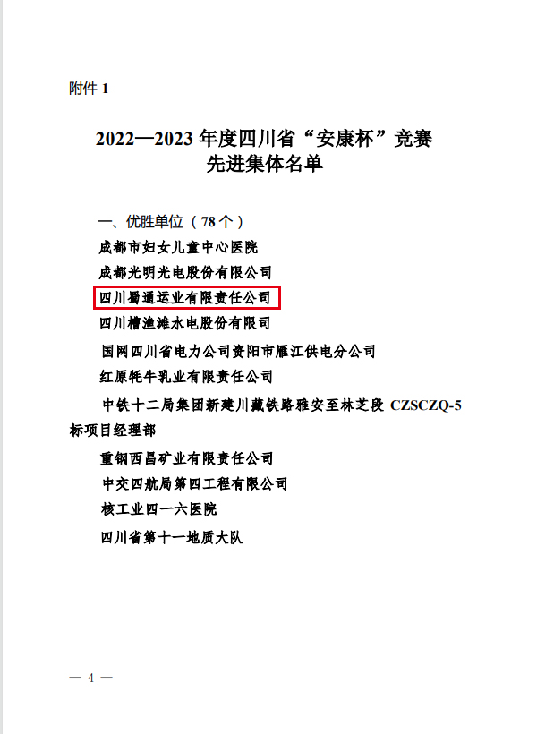 日前,省總工會(huì)、省應(yīng)急管理廳、省衛(wèi)健委聯(lián)合發(fā)文表揚(yáng)2022-2023年度四川省“安康杯”競賽先進(jìn)集體和先進(jìn)個(gè)人,蜀通公司被評為“優(yōu)勝單位”。