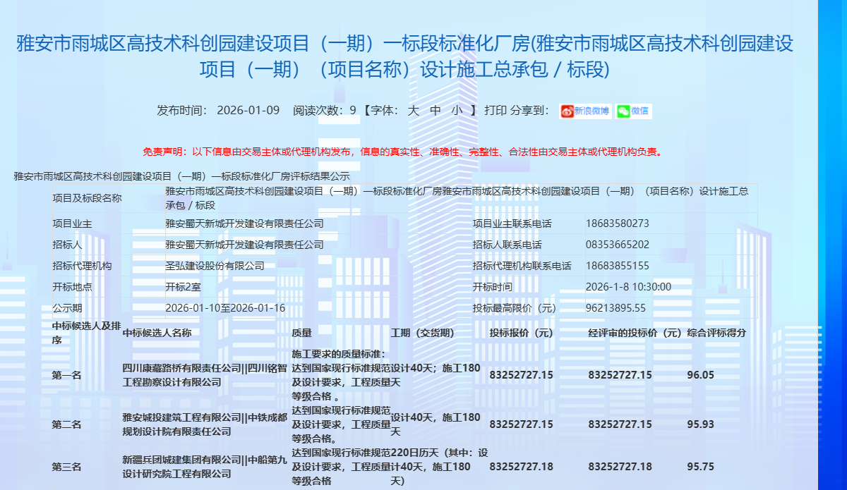蓄勢突破,奮楫開新?挡芈窐蚬境晒孬@雅安市雨城區(qū)高技術(shù)科創(chuàng)園建設(shè)項(xiàng)目(一期)一標(biāo)段標(biāo)準(zhǔn)化廠房項(xiàng)目,中標(biāo)金額8325.27萬元,為公司2026年發(fā)展強(qiáng)勢開篇,迎來馬年“開門紅”。