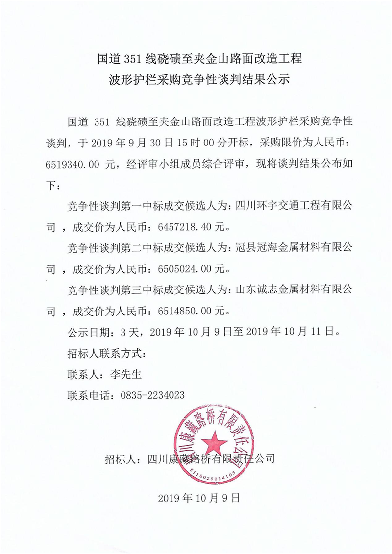 四川康藏路橋有限責任公司國道351線磽磧至夾金山路面改造工程波形護欄采購競爭性談判結(jié)果公示