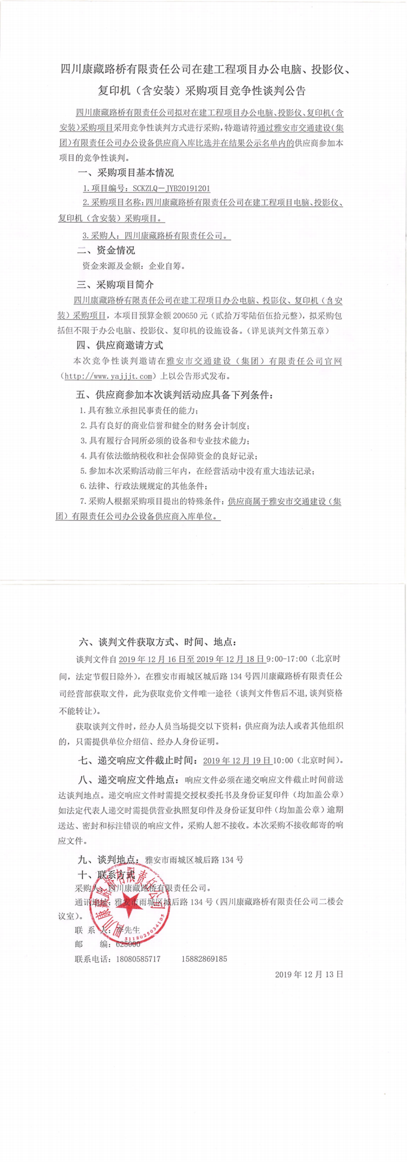 四川康藏路橋有限責(zé)任公司在建工程項(xiàng)目辦公電腦、投影儀、復(fù)印機(jī)(含安裝)采購項(xiàng)目競(jìng)爭(zhēng)性談判公告