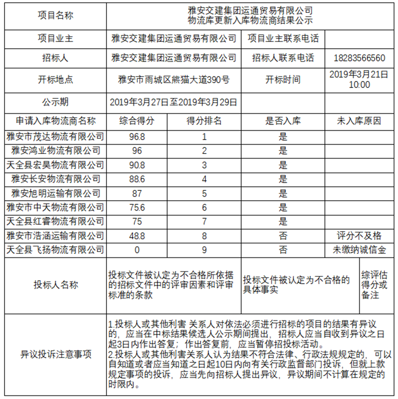雅安交建集團運通貿易有限公司物流庫更新入庫物流商結果公示