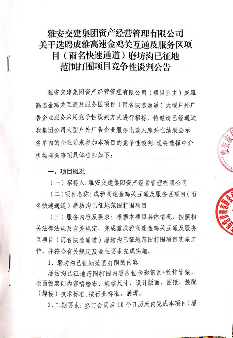 雅安交建集團(tuán)資產(chǎn)經(jīng)營管理有限公司關(guān)于選聘成雅高速金雞關(guān)互通及服務(wù)區(qū)項目(雨名快速通道)磨坊溝已征地范圍打圍項目競爭性談判公告
