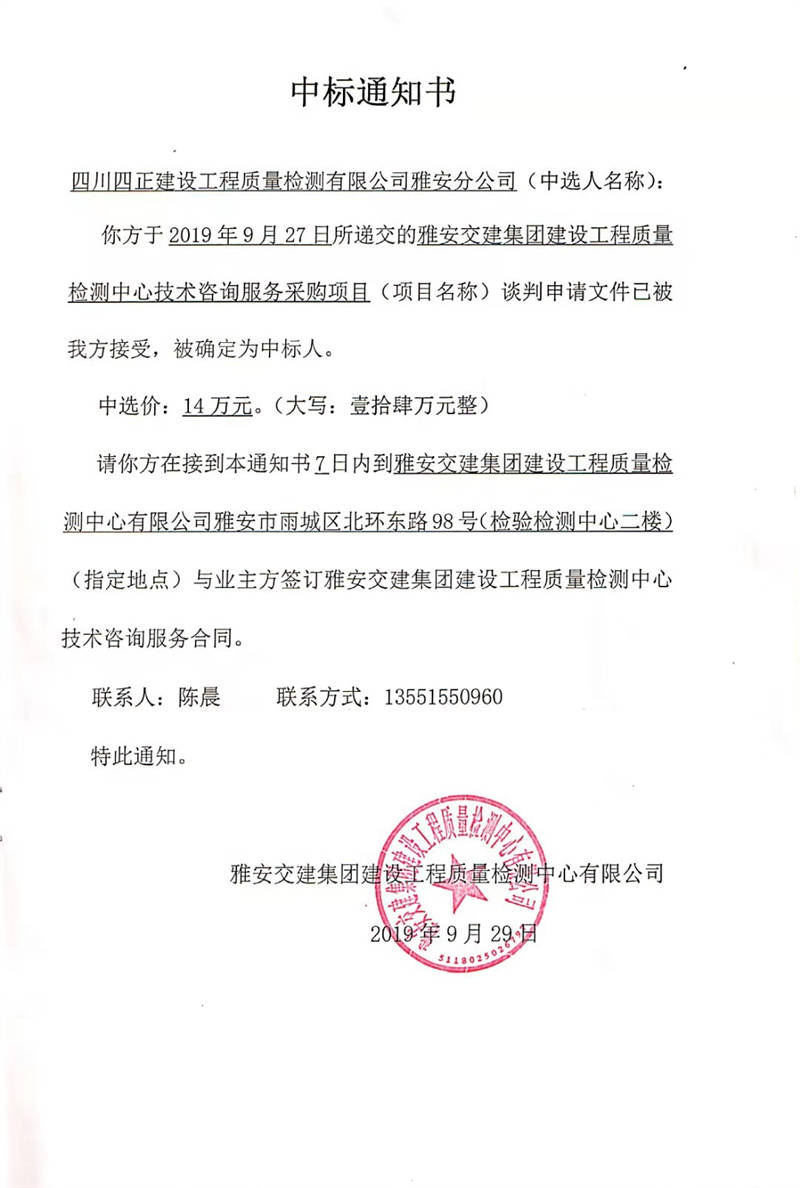 雅安交建集團(tuán)建設(shè)工程質(zhì)量檢測(cè)中心技術(shù)咨詢服務(wù)采購項(xiàng)目中標(biāo)公示