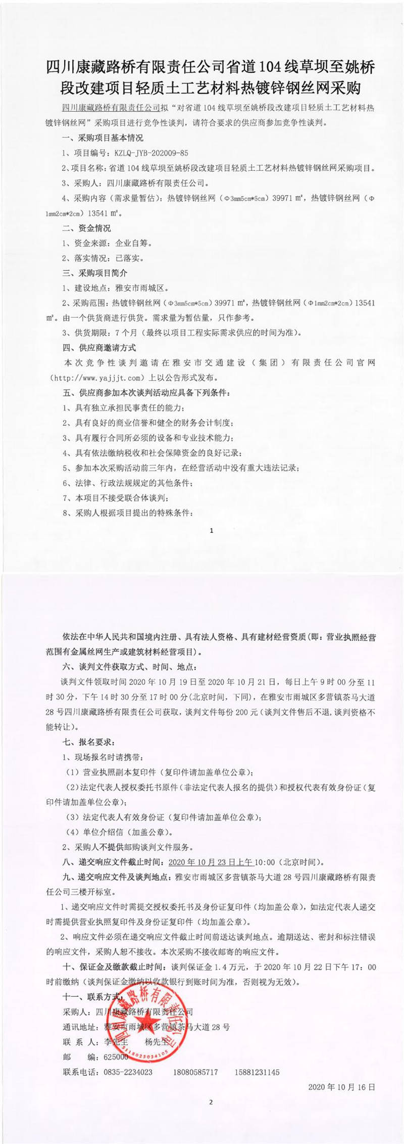 四川康藏路橋有限責(zé)任公司省道104線草壩至姚橋段改建項(xiàng)目輕質(zhì)土工藝材料熱鍍鋅鋼絲網(wǎng)采購(gòu)競(jìng)爭(zhēng)性談判公告