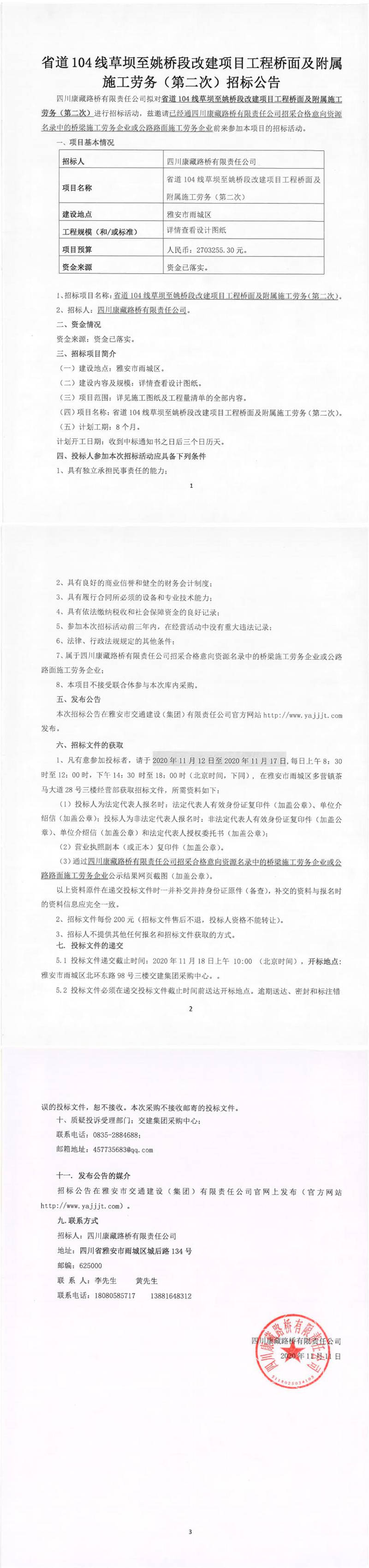 四川康藏路橋有限責(zé)任公司省道104線(xiàn)草壩至姚橋段改建項(xiàng)目工程橋面及附屬施工勞務(wù)(第二次)招標(biāo)公告