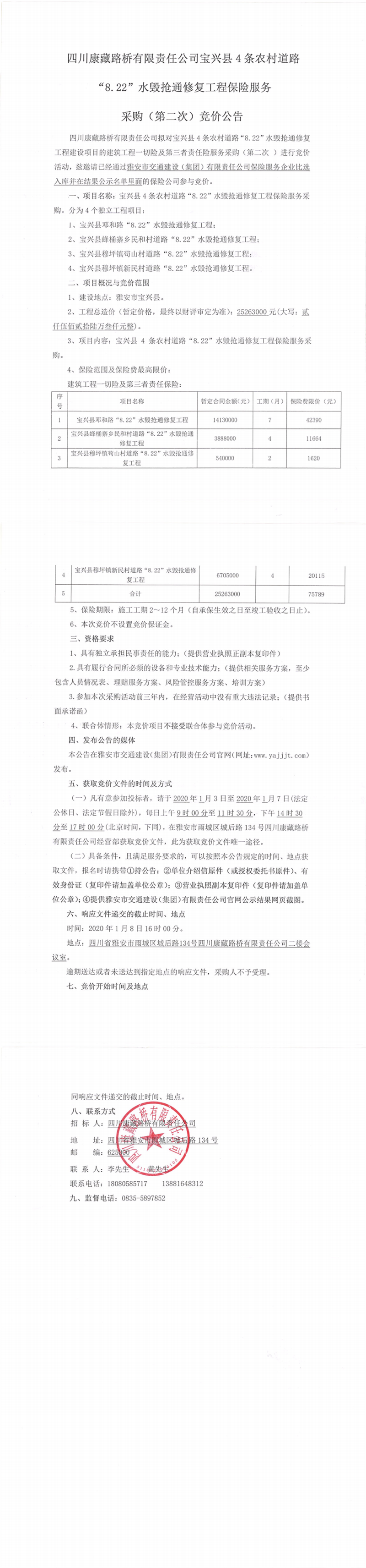 四川康藏路橋有限責(zé)任公司寶興縣4條農(nóng)村道路“8.22”水毀搶通修復(fù)工程保險(xiǎn)服務(wù)采購(gòu)(第二次)競(jìng)價(jià)公告
