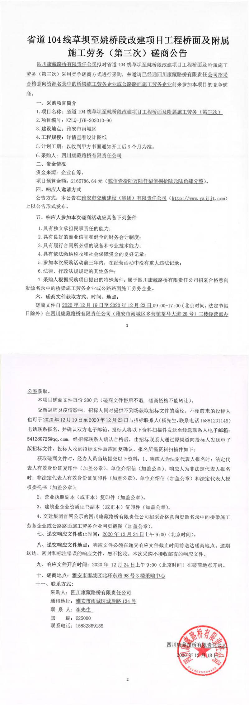 四川康藏路橋有限責任公司省道104線草壩至姚橋段改建項目工程橋面及附屬施工勞務(第三次)磋商公告