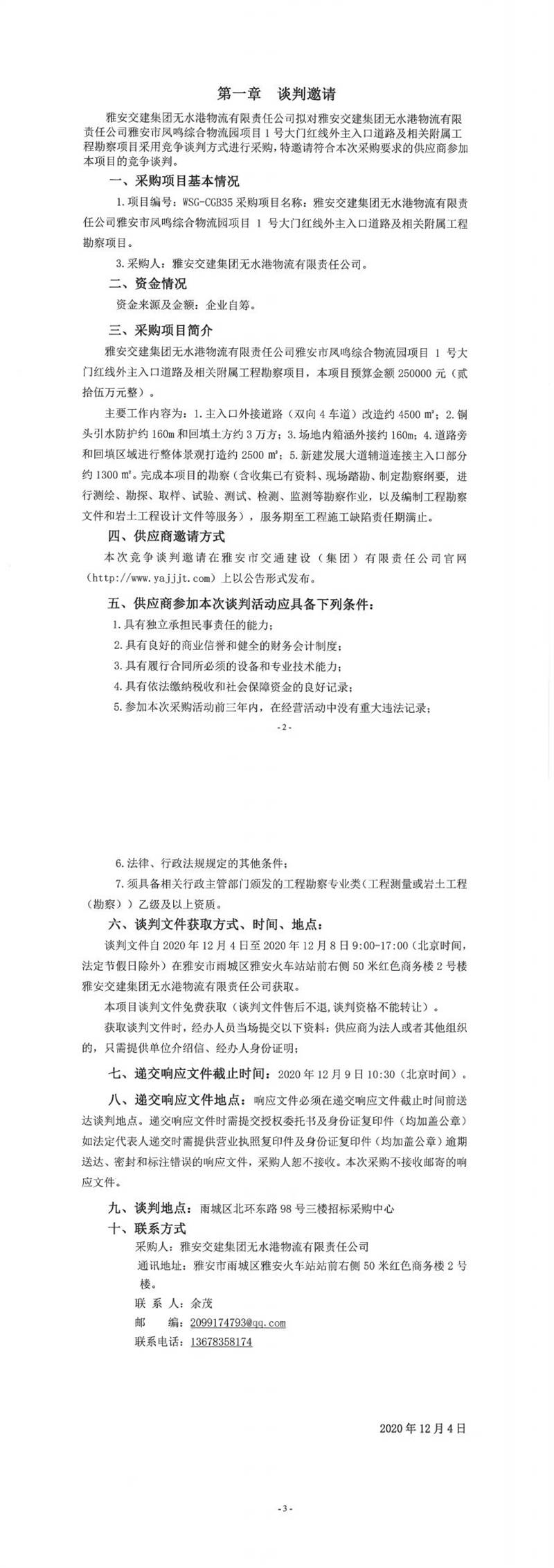 雅安交建集團無水港物流有限責任公司雅安市鳳鳴綜合物流園項目1號大門紅線外主入口道路及相關附屬工程勘察項目談判公告