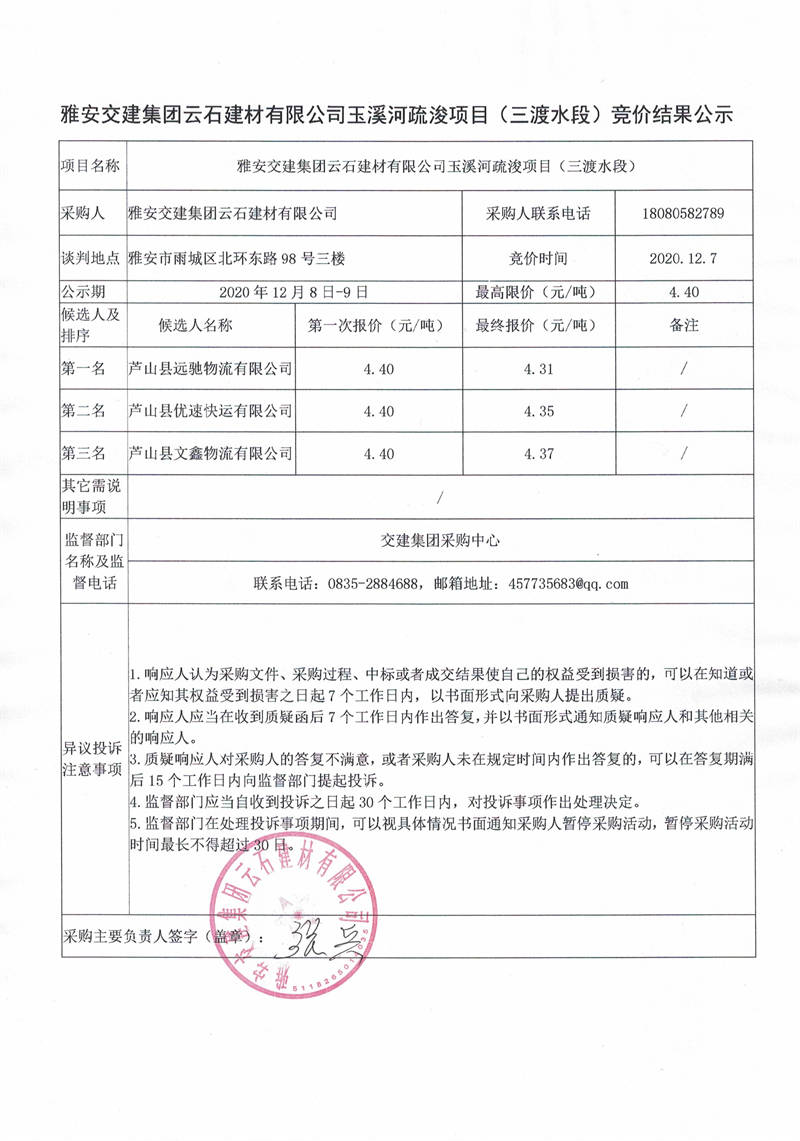 雅安交建集團云石建材有限公司玉溪河疏浚項目(三渡水段)競價結(jié)果公示