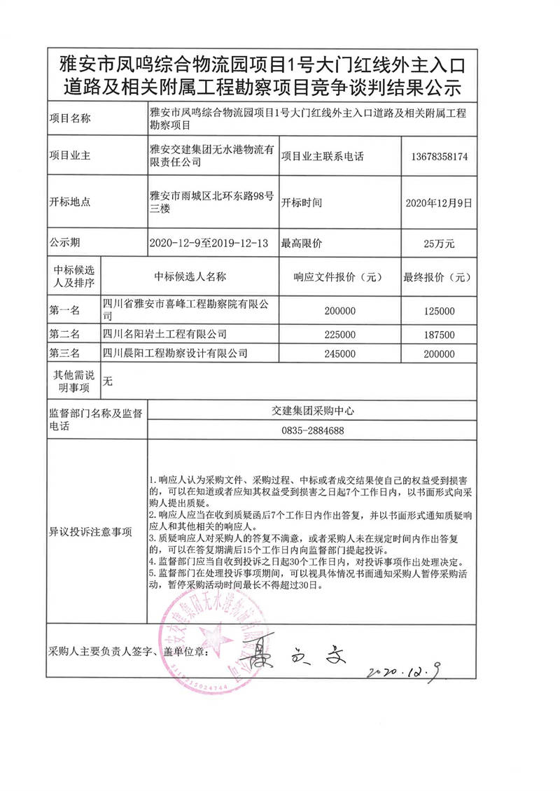 雅安交建集團(tuán)無水港物流有限責(zé)任公司雅安市鳳鳴綜合物流園項(xiàng)目1號大門紅線外主入口道路及相關(guān)附屬工程勘察項(xiàng)目競爭談判結(jié)果公示