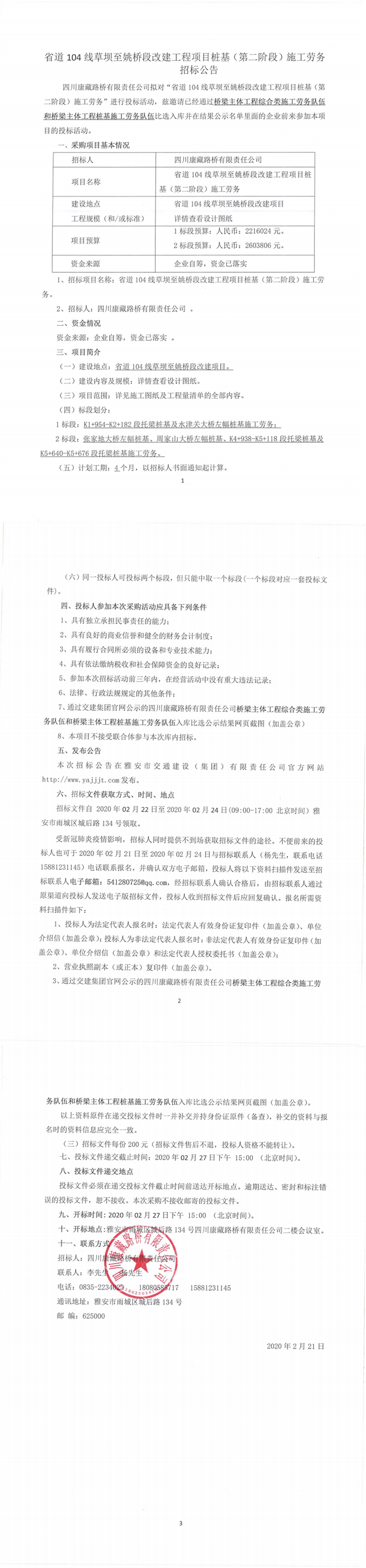 四川康藏路橋有限責任公司省道104線草壩至姚橋段改建工程項目樁基(第二階段)施工勞務(wù)招標公告