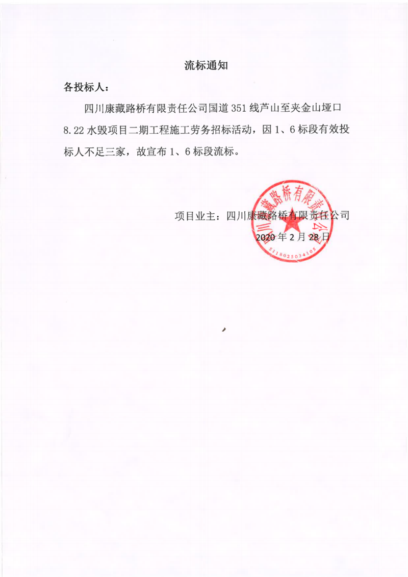 四川康藏路橋有限責(zé)任公司國道351線蘆山至夾金山埡口8.22水毀項目二期工程施工勞務(wù)(1標段、6標段)流標通知