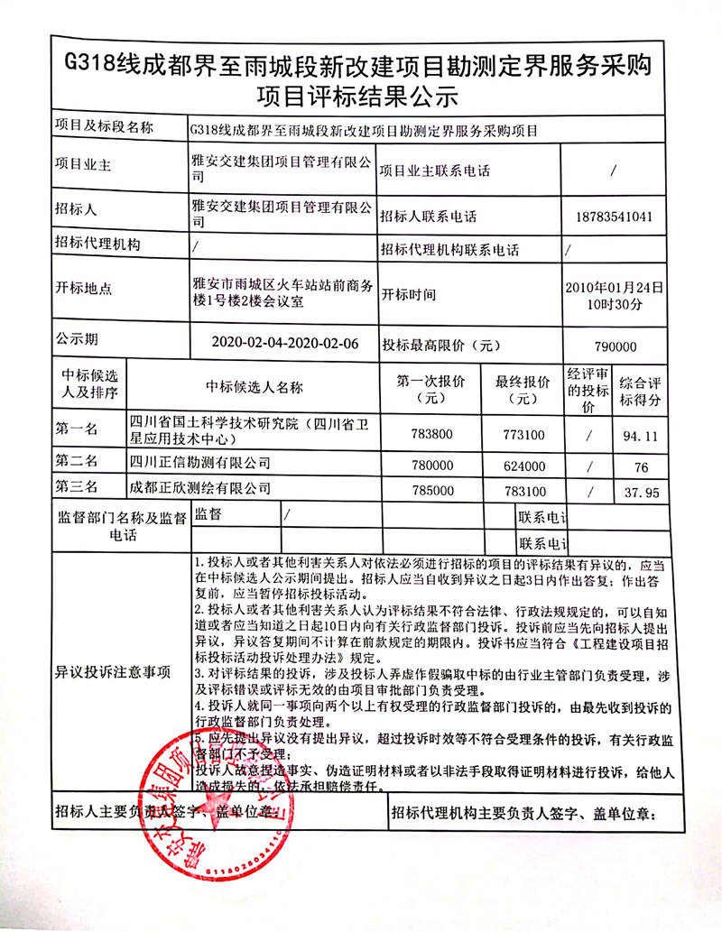 雅安交建集團(tuán)項(xiàng)目管理有限公司G318線成都界至雨城段新改建項(xiàng)目勘測(cè)定界服務(wù)采購項(xiàng)目評(píng)標(biāo)結(jié)果公示