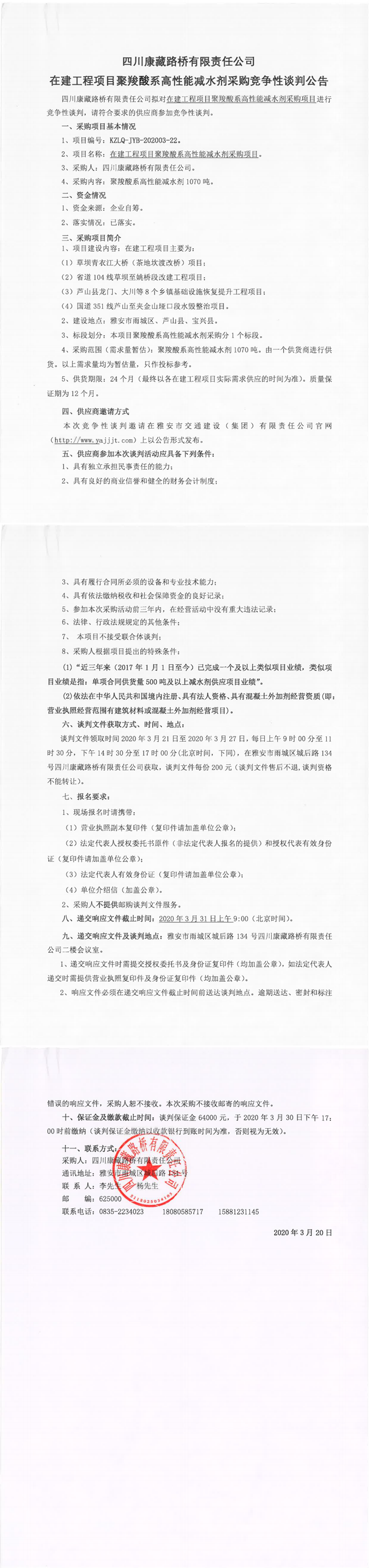 四川康藏路橋有限責(zé)任公司在建工程項目聚羧酸系高性能減水劑采購競爭性談判公告
