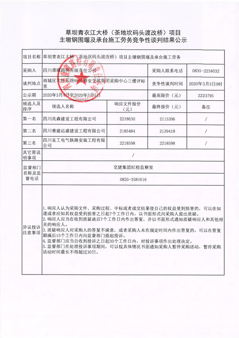 四川康藏路橋有限責(zé)任公司草壩青衣江大橋(茶地坎碼頭渡改橋)項目主墩鋼圍堰及承臺施工勞務(wù)競爭性談判結(jié)果公示