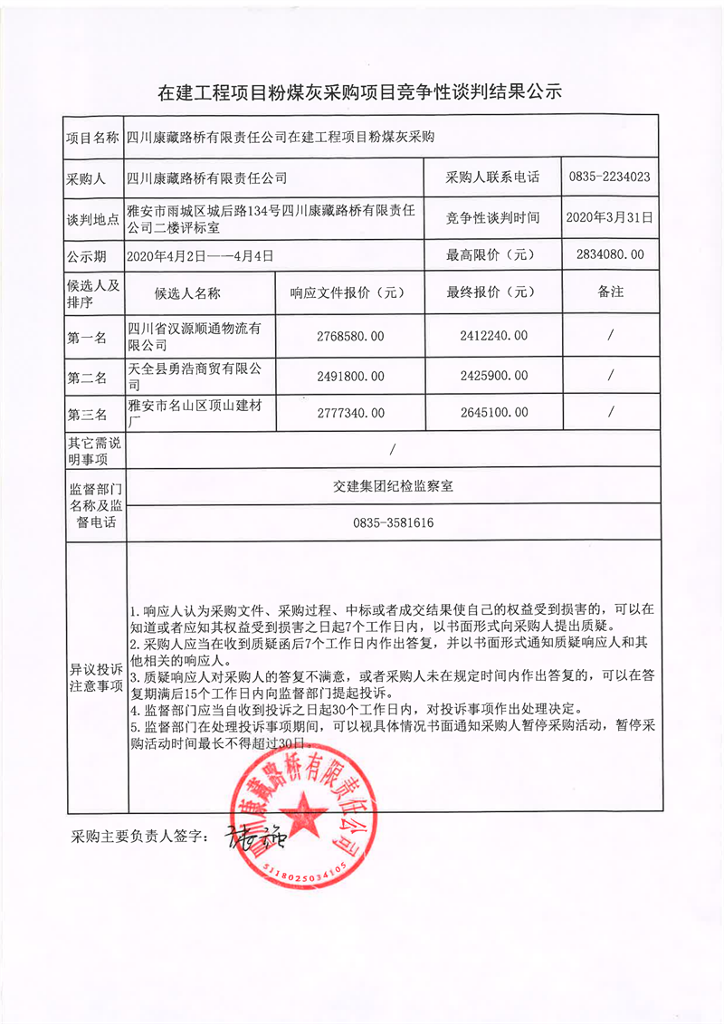 四川康藏路橋有限責(zé)任公司在建工程項(xiàng)目粉煤灰采購(gòu)項(xiàng)目競(jìng)爭(zhēng)性談判結(jié)果公示