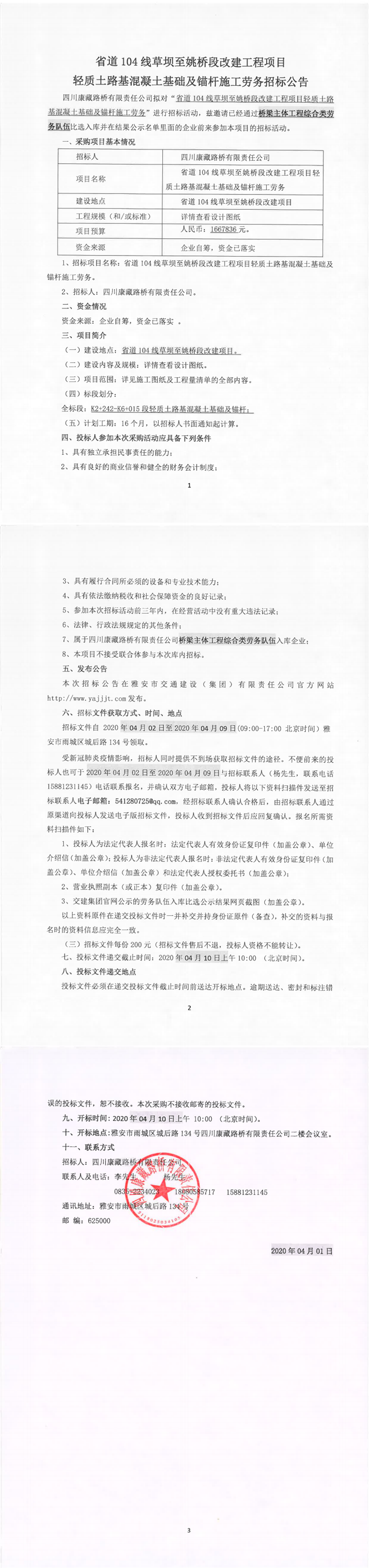 四川康藏路橋有限責(zé)任公司省道104線草壩至姚橋段改建工程項目輕質(zhì)土路基混凝土基礎(chǔ)及錨桿施工勞務(wù)招標公告