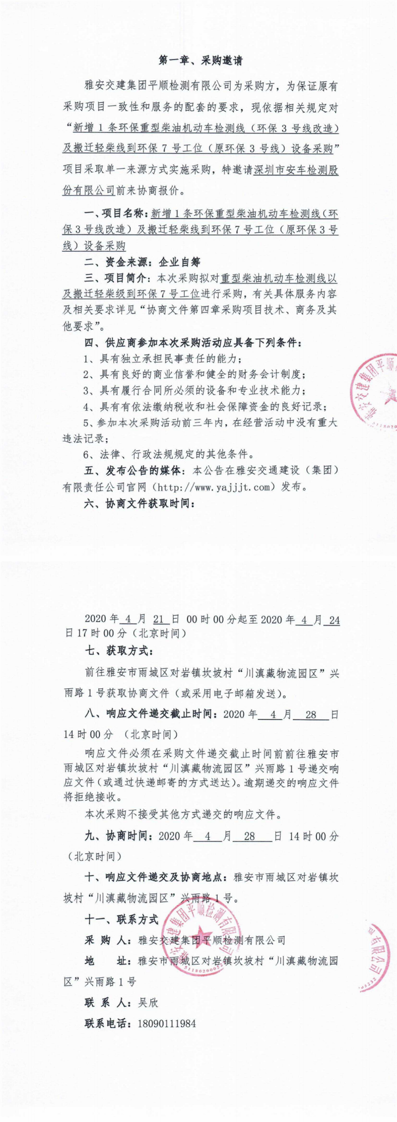 雅安交建集團(tuán)平順檢測(cè)有限公司新增1條環(huán)保重型柴油機(jī)動(dòng)車檢測(cè)線(環(huán)保3號(hào)線改造)及搬遷輕柴線到環(huán)保7號(hào)工位(原環(huán)保3號(hào)線)設(shè)備采購(gòu)單一來源協(xié)商公告