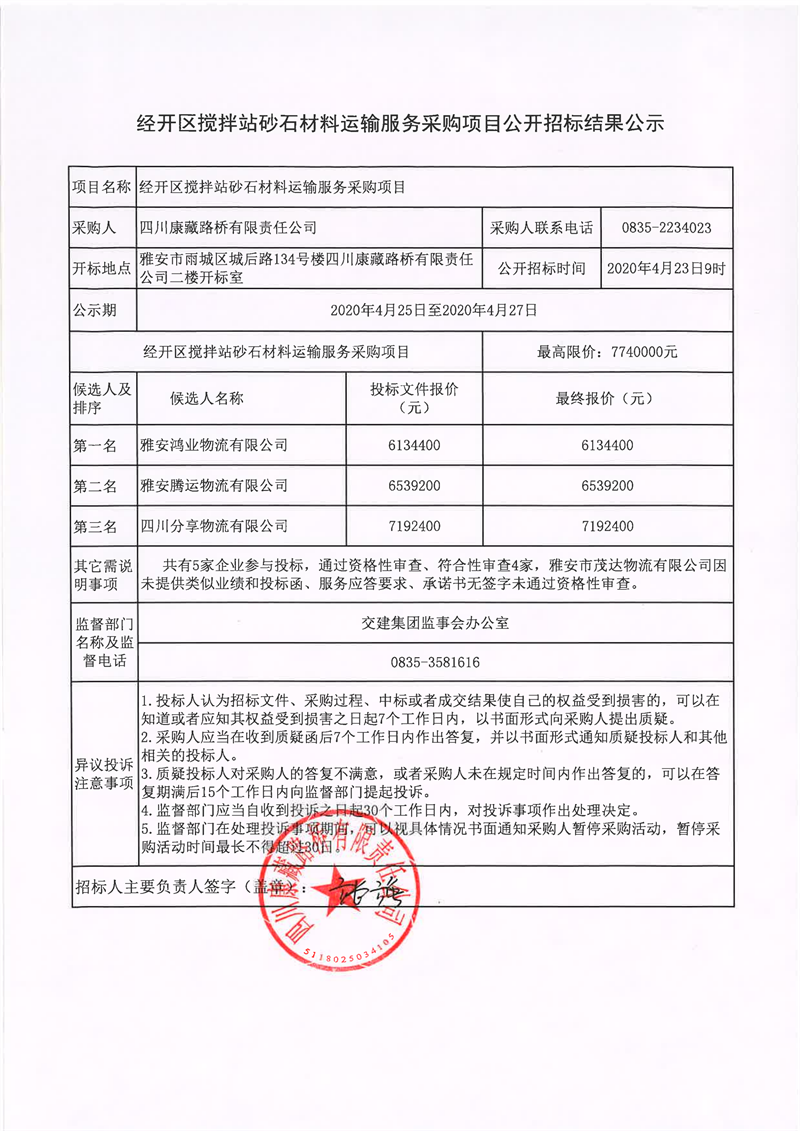 四川康藏路橋有限責(zé)任公司經(jīng)開區(qū)攪拌站砂石材料運(yùn)輸服務(wù)采購項(xiàng)目公開招標(biāo)結(jié)果公示