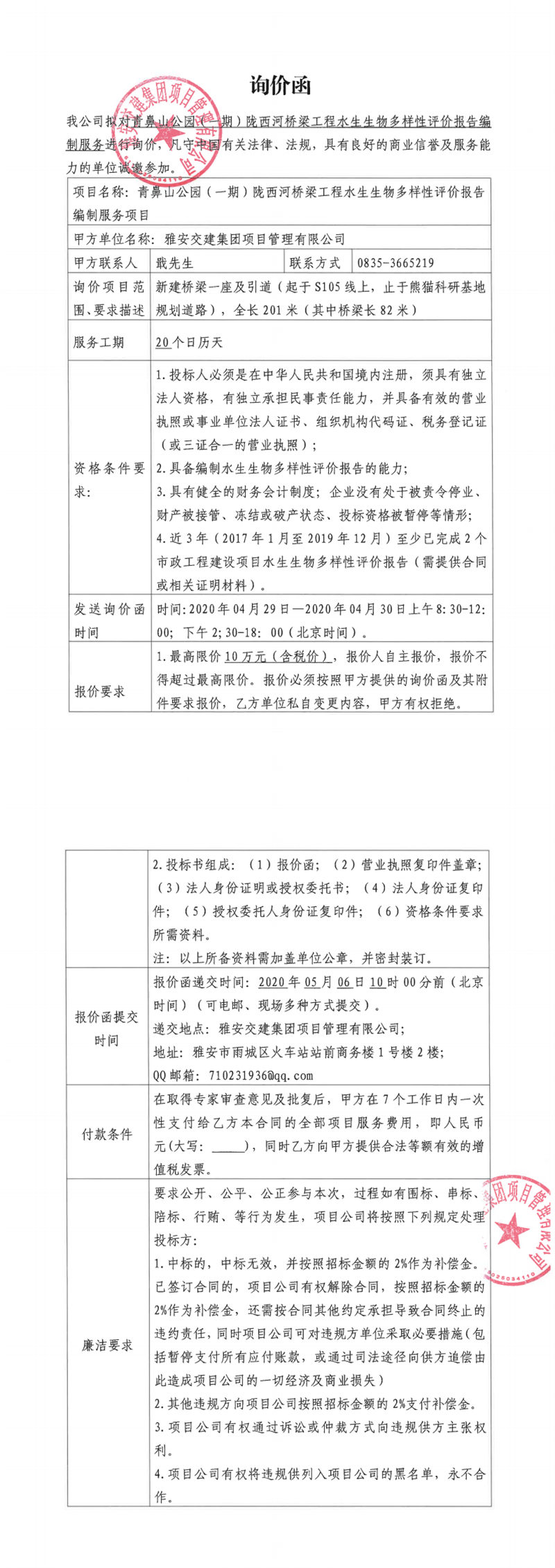 雅安交建集團(tuán)項目管理有限公司青鼻山公園(一期)隴西河橋梁工程水生生物多樣性評價報告編制服務(wù)項目詢價函