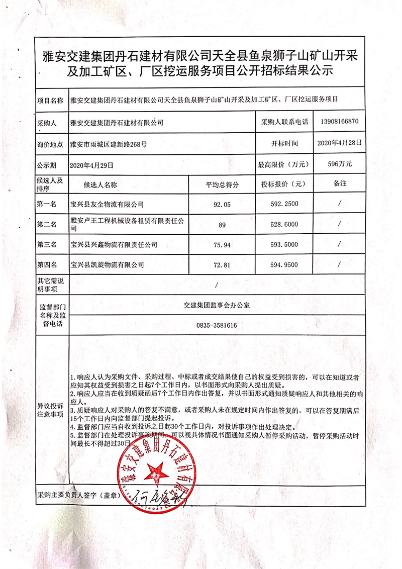 雅安交建集團丹石建材有限公司天全縣魚泉獅子山礦山開采及加工礦區(qū)、廠區(qū)挖運服務項目公開招標結(jié)果公示