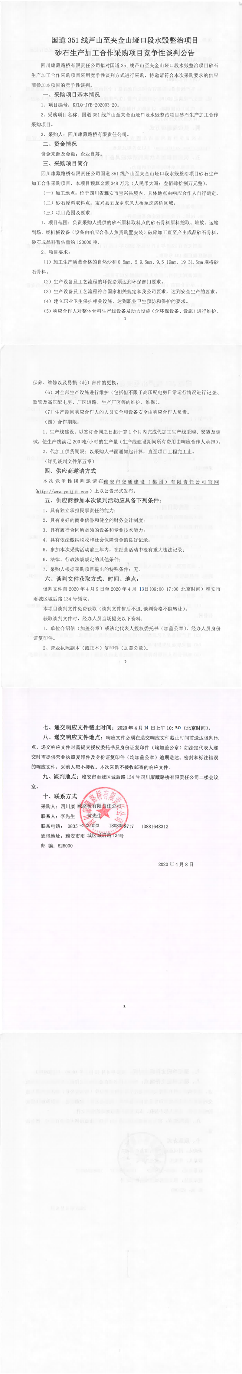 四川康藏路橋有限責(zé)任公司國(guó)道351線(xiàn)蘆山至夾金山埡口段水毀整治項(xiàng)目砂石生產(chǎn)加工合作采購(gòu)項(xiàng)目競(jìng)爭(zhēng)性談判公告