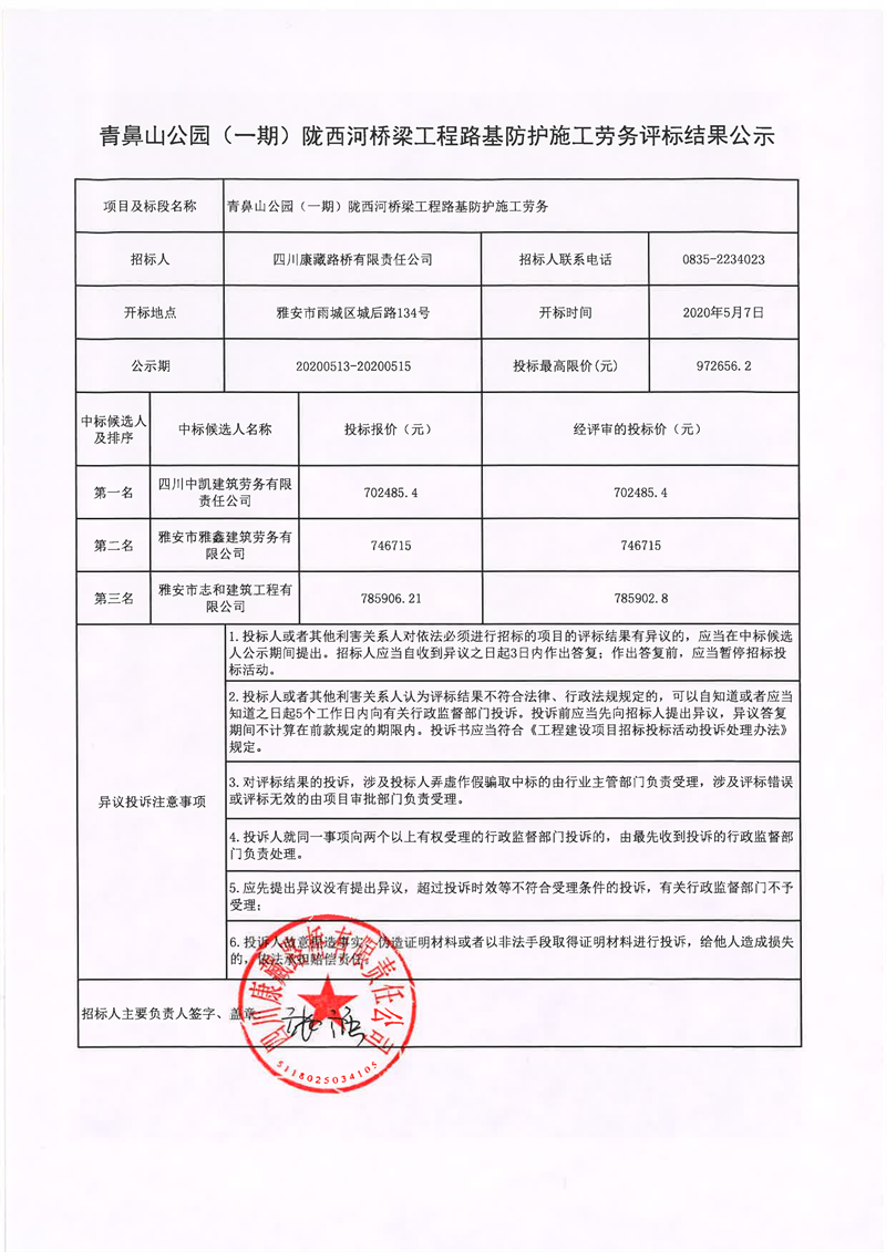 四川康藏路橋有限責任公司青鼻山公園(一期)隴西河橋梁工程路基防護施工勞務評標結(jié)果公示