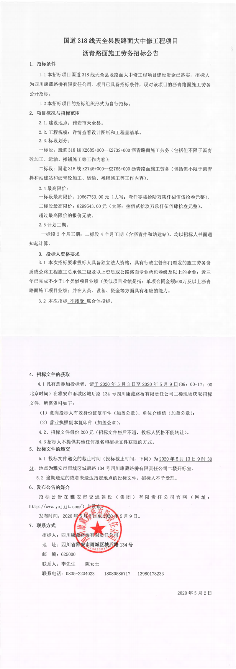 四川康藏路橋有限責任公司國道318線天全縣段路面大中修工程項目瀝青路面施工勞務(wù)招標公告