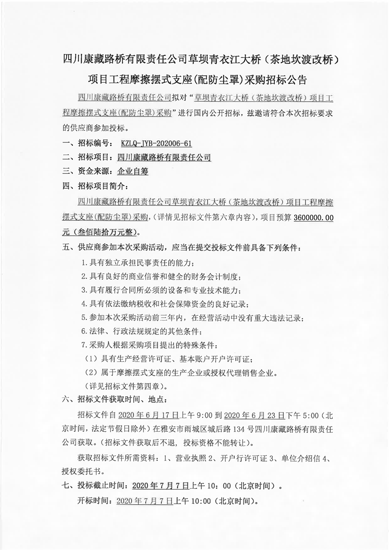 四川康藏路橋有限責(zé)任公司草壩青衣江大橋(茶地坎渡改橋)項目工程摩擦擺式支座(配防塵罩)采購招標公告