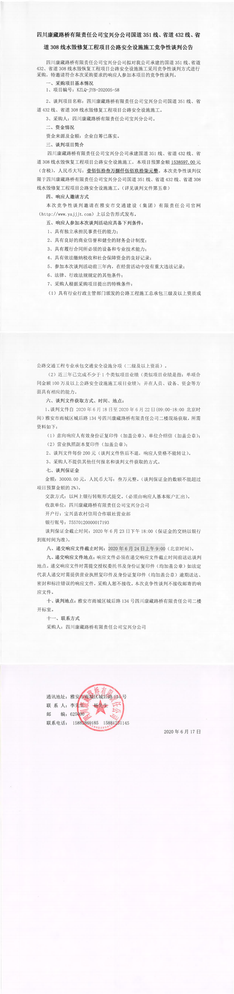四川康藏路橋有限責任公司寶興分公司國道351線、省道432線、省道308線水毀修復(fù)工程項目公路安全設(shè)施施工競爭性談判公告