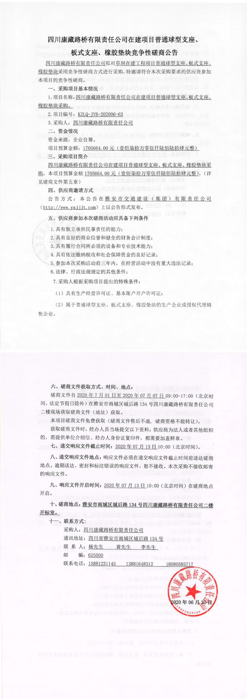 四川康藏路橋有限責(zé)任公司在建項目普通球型支座、板式支座、橡膠墊塊采購競爭性磋商公告