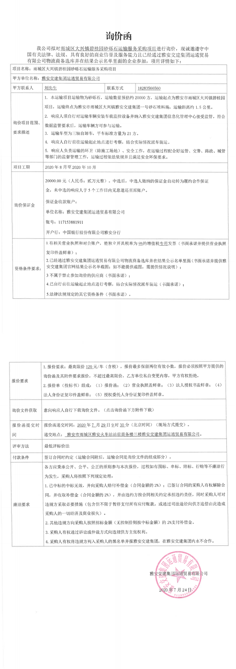 雅安交建集團(tuán)運(yùn)通貿(mào)易有限公司雨城區(qū)大興鎮(zhèn)碧桂園砂礫石運(yùn)輸服務(wù)采購項(xiàng)目詢價函