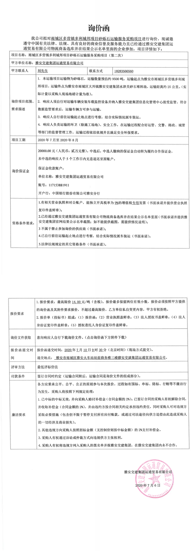 雅安交建集團(tuán)運(yùn)通貿(mào)易有限公司雨城區(qū)多營鎮(zhèn)多利城邦項(xiàng)目砂礫石運(yùn)輸服務(wù)采購項(xiàng)目(第二次)詢價函