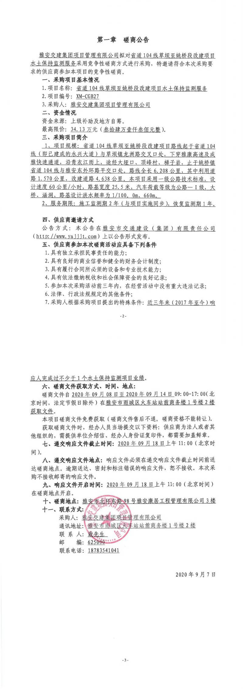 雅安交建集團(tuán)項(xiàng)目管理有限公司省道104線草壩至姚橋段改建項(xiàng)目水土保持監(jiān)測服務(wù)競爭性磋商公告