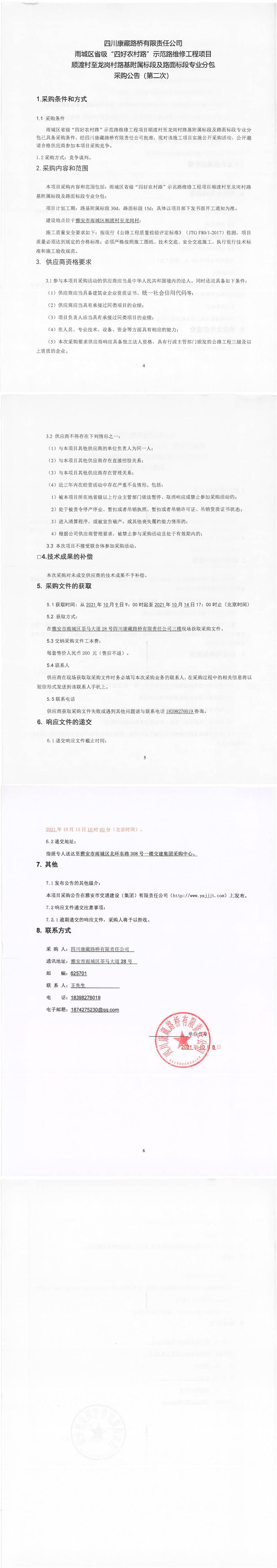 四川康藏路橋有限責(zé)任公司雨城區(qū)省級(jí)“四好農(nóng)村路”示范路維修工程項(xiàng)目順渡村至龍崗村路基附屬標(biāo)段及路面標(biāo)段專(zhuān)業(yè)分包采購(gòu)公告(第二次)