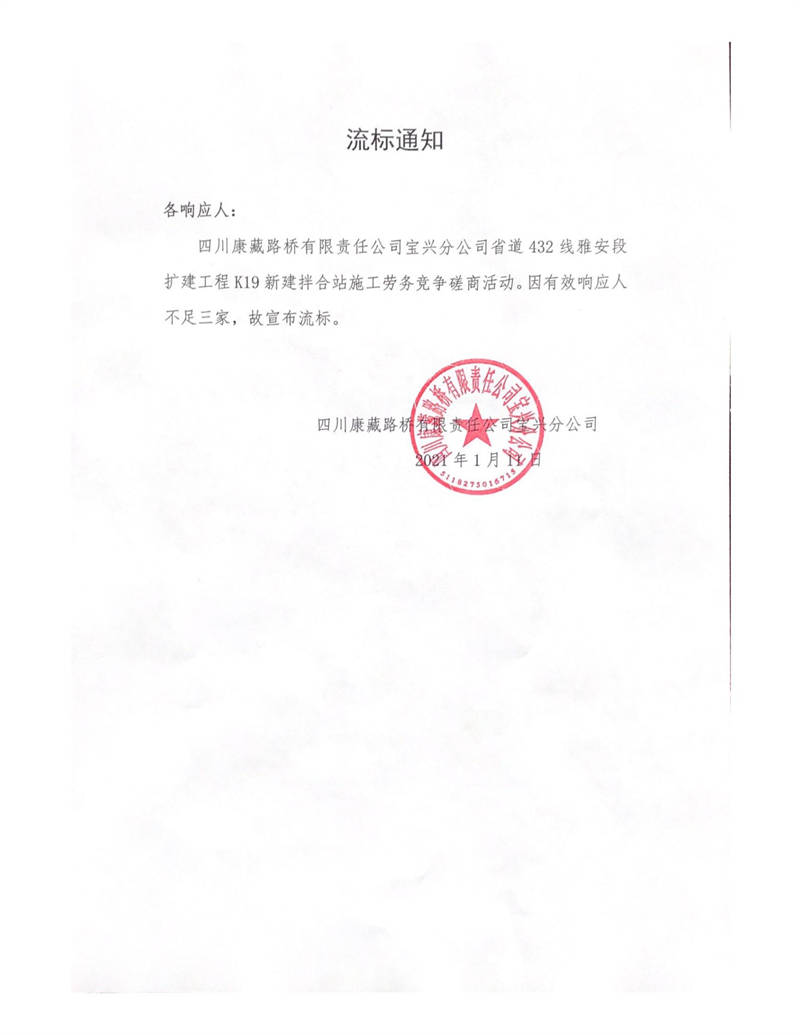 四川康藏路橋有限責(zé)任公司寶興分公司省道432線雅安段擴(kuò)建工程K19新建拌合站施工勞務(wù)競(jìng)爭(zhēng)磋商流標(biāo)通知