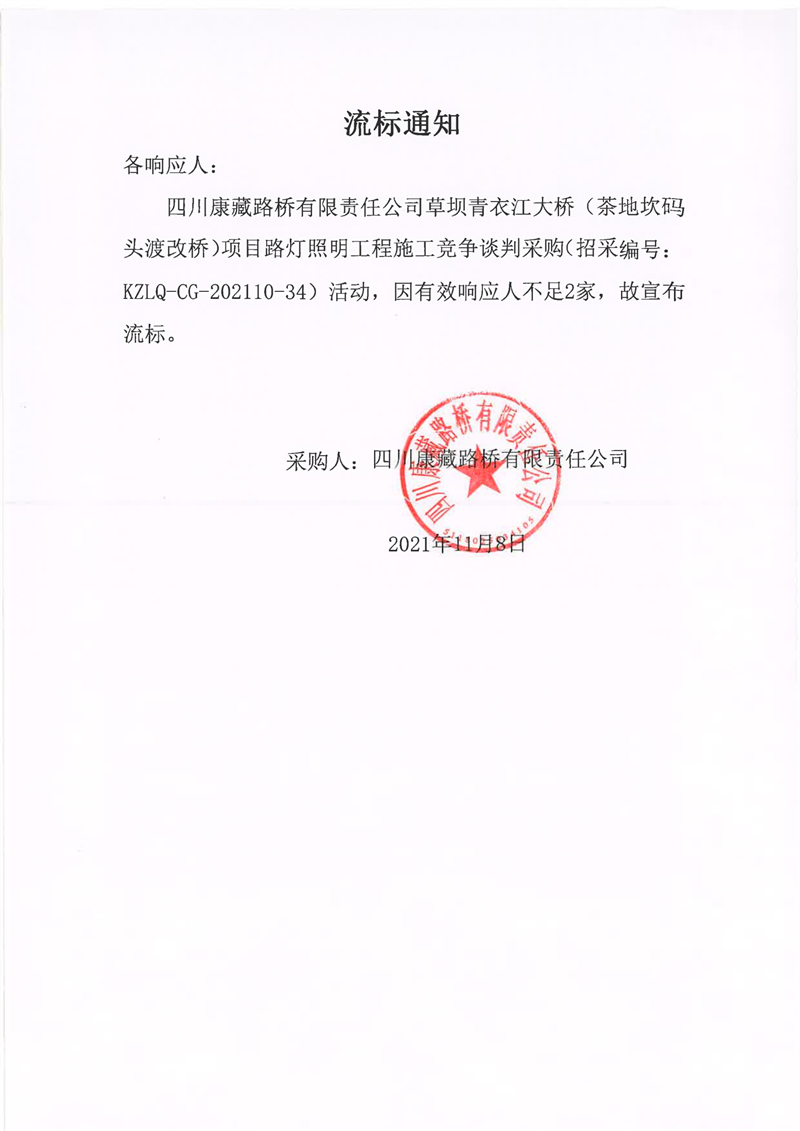 四川康藏路橋有限責(zé)任公司草壩青衣江大橋(茶地坎碼頭渡改橋)項(xiàng)目路燈照明工程施工流標(biāo)通知