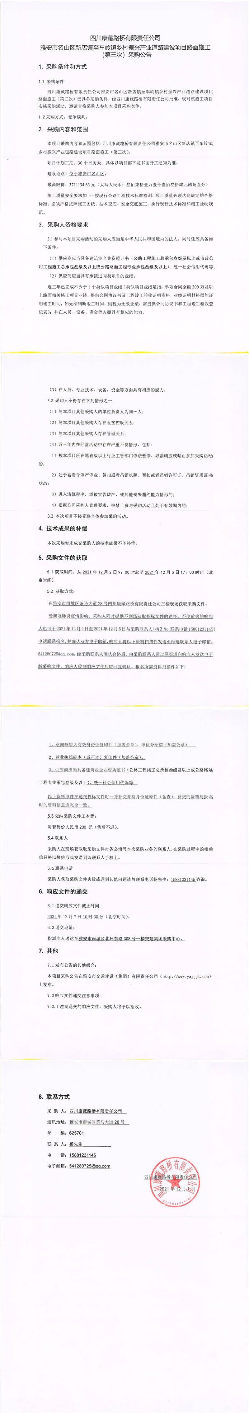 四川康藏路橋有限責任公司雅安市名山區(qū)新店鎮(zhèn)至車嶺鎮(zhèn)鄉(xiāng)村振興產(chǎn)業(yè)道路建設項目路面施工(第三次)采購公告