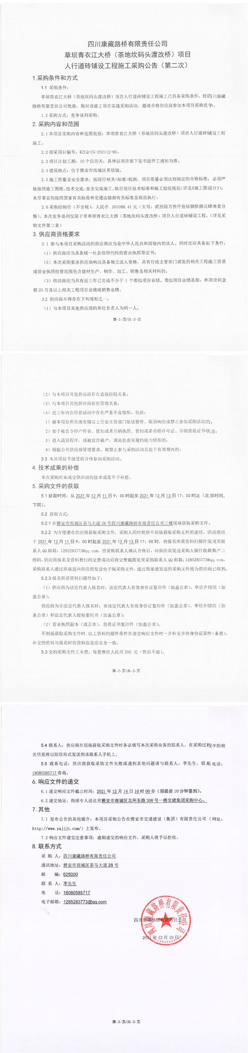 四川康藏路橋有限責(zé)任公司草壩青衣江大橋(茶地坎碼頭渡改橋)項(xiàng)目人行道磚鋪設(shè)工程施工采購(gòu)公告(第二次)