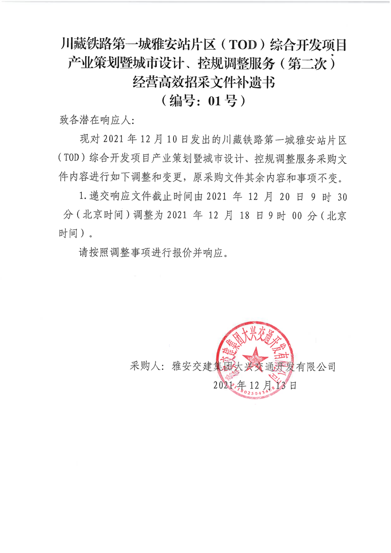 雅安交建集團大興交通開發(fā)有限公司川藏鐵路第一城雅安站片區(qū)(TOD)綜合開發(fā)項目產(chǎn)業(yè)策劃暨城市設計、控規(guī)調整服務(第二次)經(jīng)營高效招采文件補遺書(編號:01號)