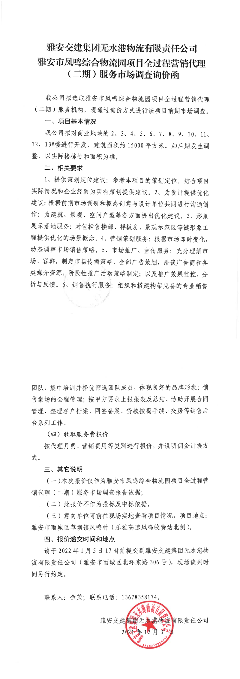 雅安交建集團無水港物流有限責任公司雅安市鳳鳴綜合物流園項目全過程營銷代理(二期)服務市場調(diào)查詢價函