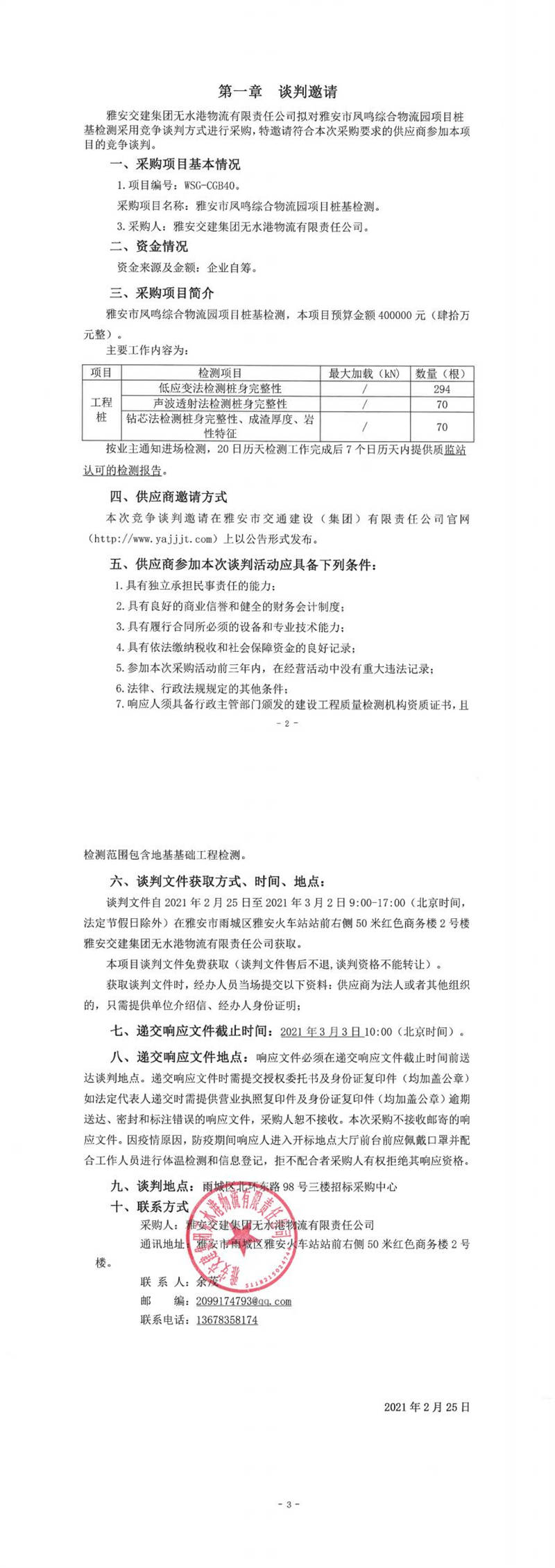 雅安交建集團(tuán)無水港物流有限責(zé)任公司雅安市鳳鳴綜合物流園項(xiàng)目樁基檢測競爭談判公告