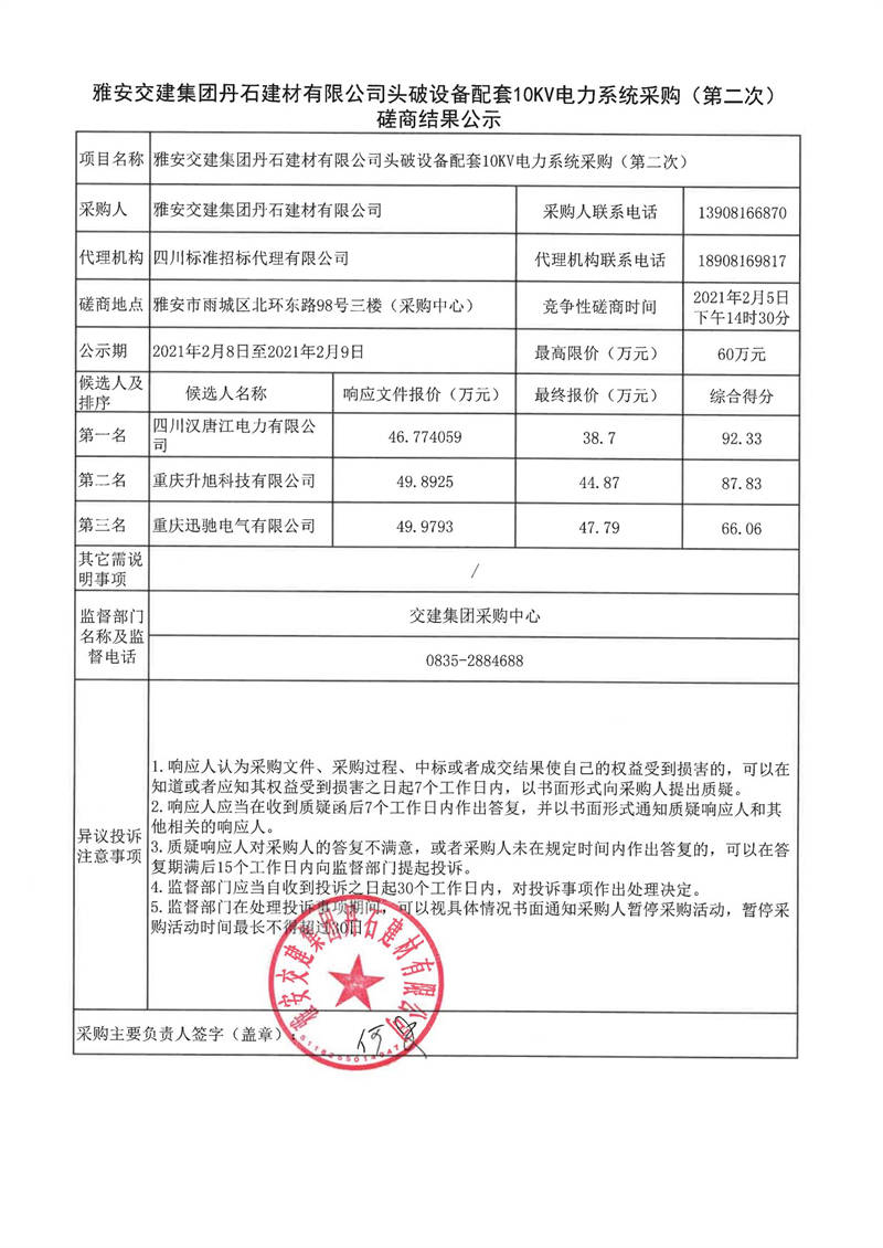 雅安交建集團丹石建材有限公司頭破設備配套10KV電力系統(tǒng)采購(第二次)磋商結果公示