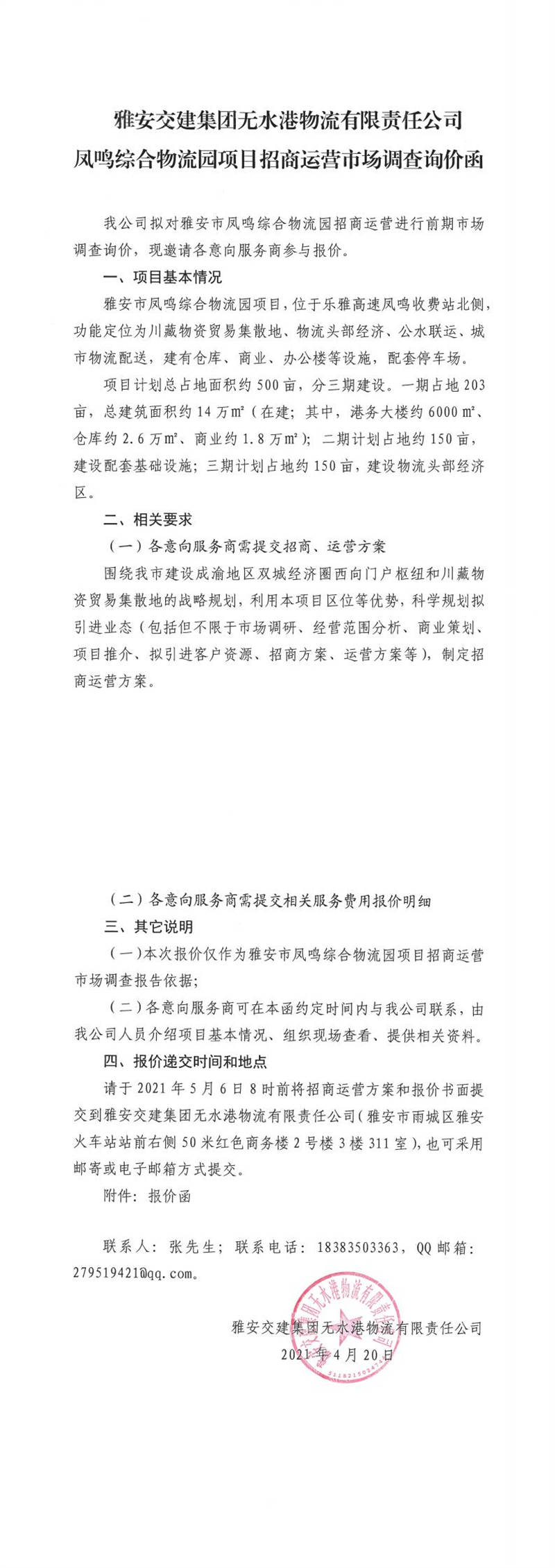 雅安交建集團(tuán)無水港物流有限責(zé)任公司雅安市鳳鳴綜合物流園項(xiàng)目招商運(yùn)營(yíng)市場(chǎng)調(diào)查詢價(jià)函