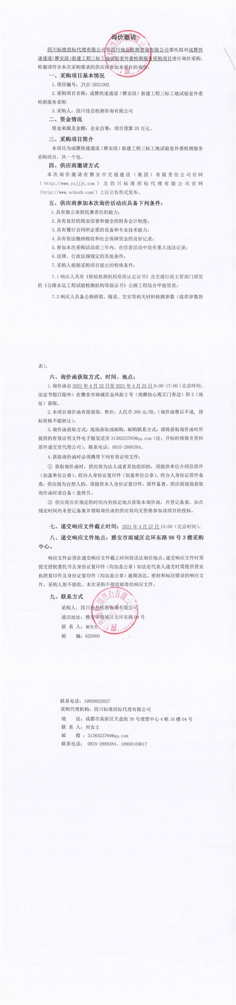 四川佳岳檢測咨詢有限公司成雅快速通道(雅安段)新建工程三標工地試驗室外委檢測服務采購詢價公告