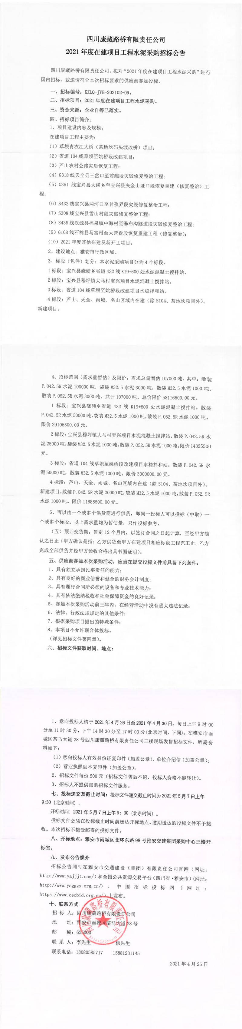 四川康藏路橋有限責任公司2021年度在建項目工程水泥采購招標公告