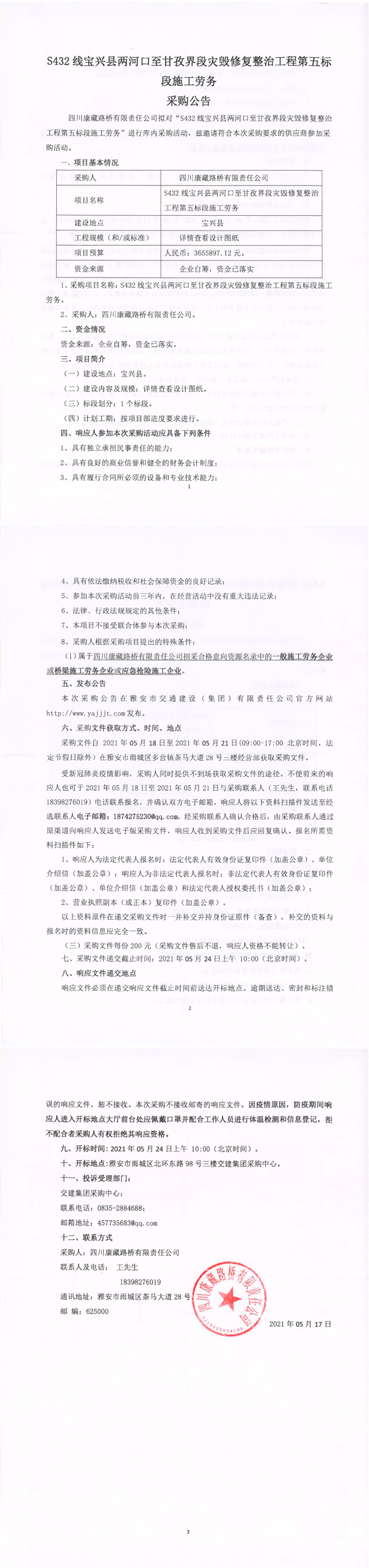 四川康藏路橋有限責(zé)任公司S432線寶興縣兩河口至甘孜界段災(zāi)毀修復(fù)整治工程第五標(biāo)段施工勞務(wù)采購(gòu)公告