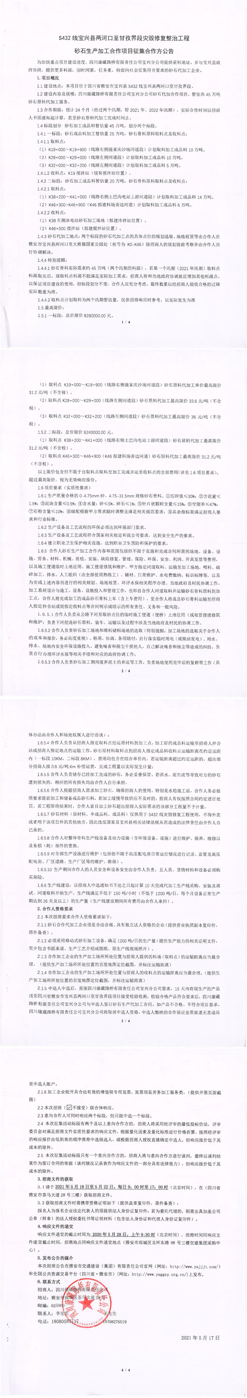 四川康藏路橋有限責(zé)任公司S432線寶興縣兩河口至甘孜界段災(zāi)毀修復(fù)整治工程砂石生產(chǎn)加工合作項目征集合作方公告